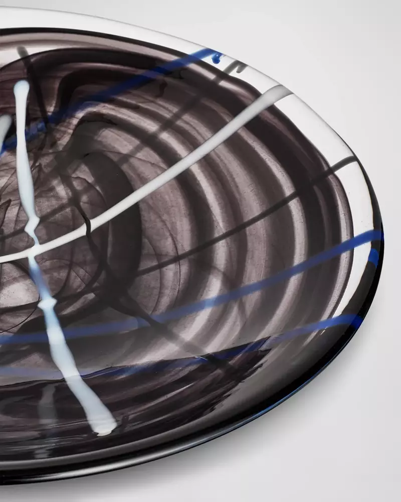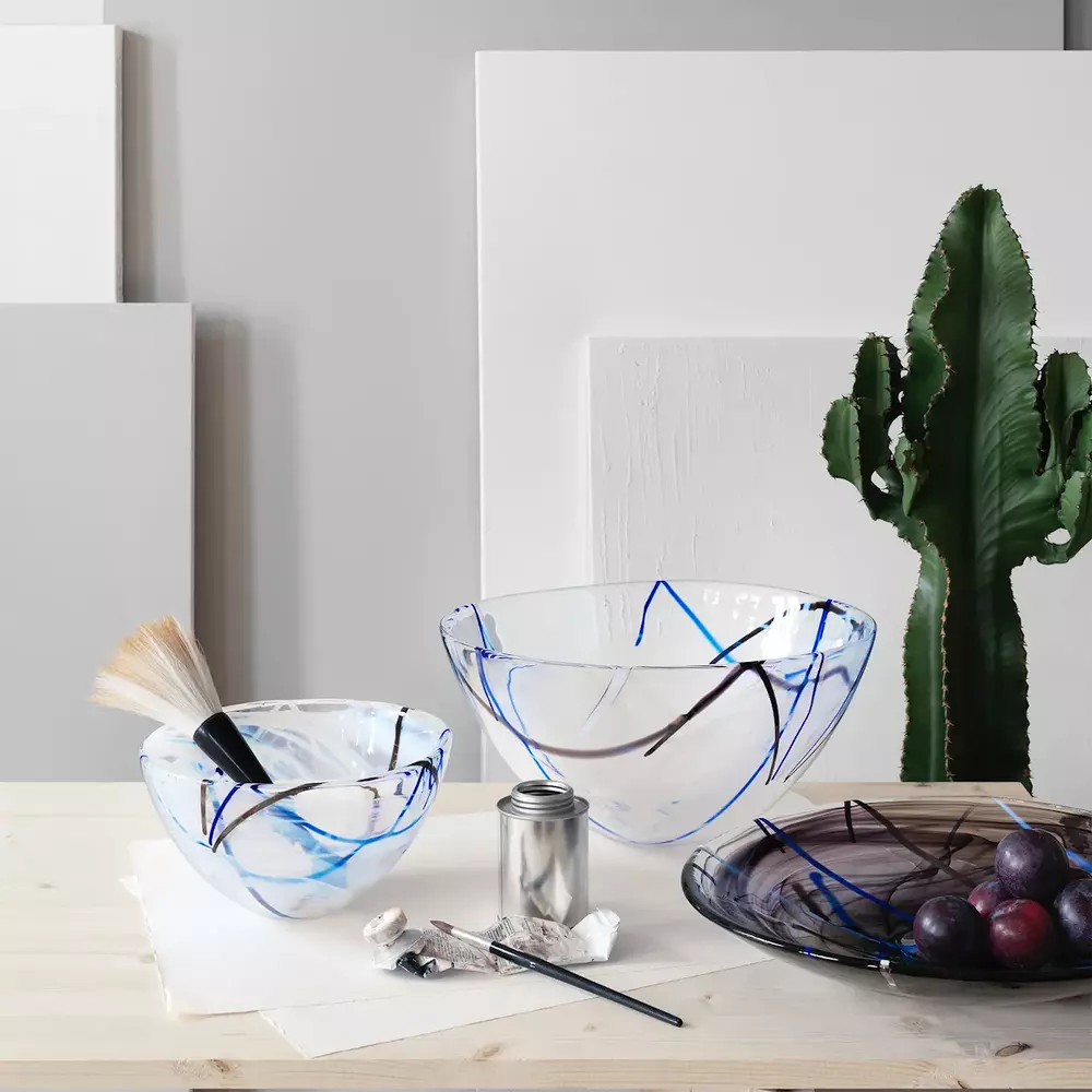 The Contrast series is manufactured using a technique called centrifugation. The technique, invented in Sweden’s Kingdom of Crystal in the 1950s, creates veils of color inside the glass mass. In combination with the color powder and sticks added during the process, each piece becomes unique. The black bowl is just beautiful on its own – or why not filled with fruit?