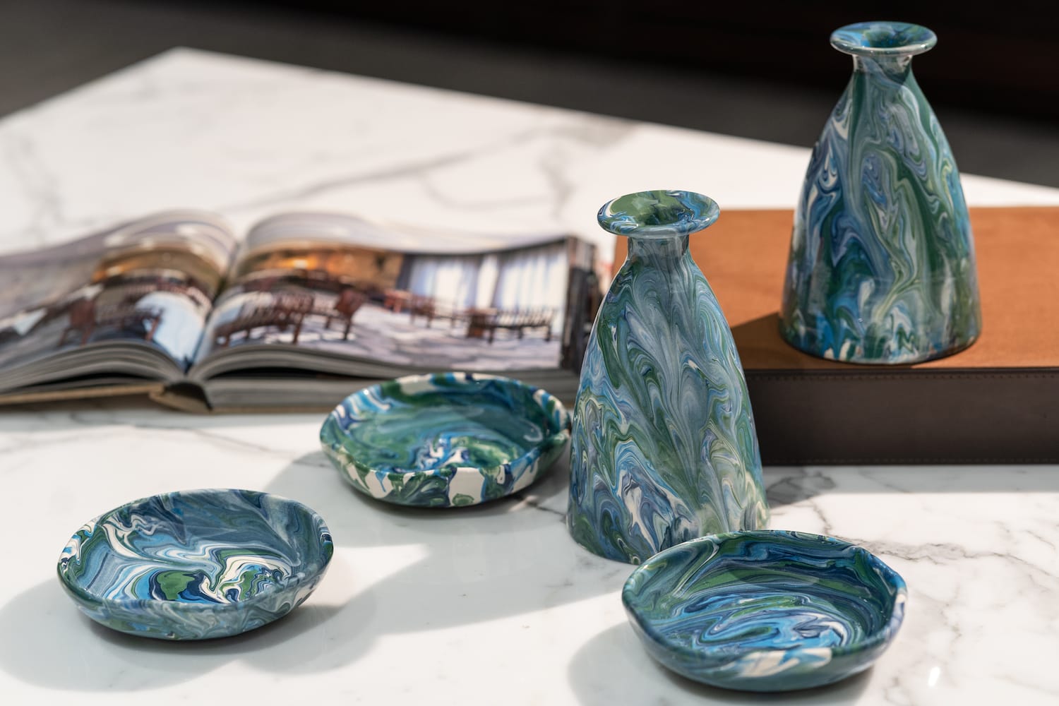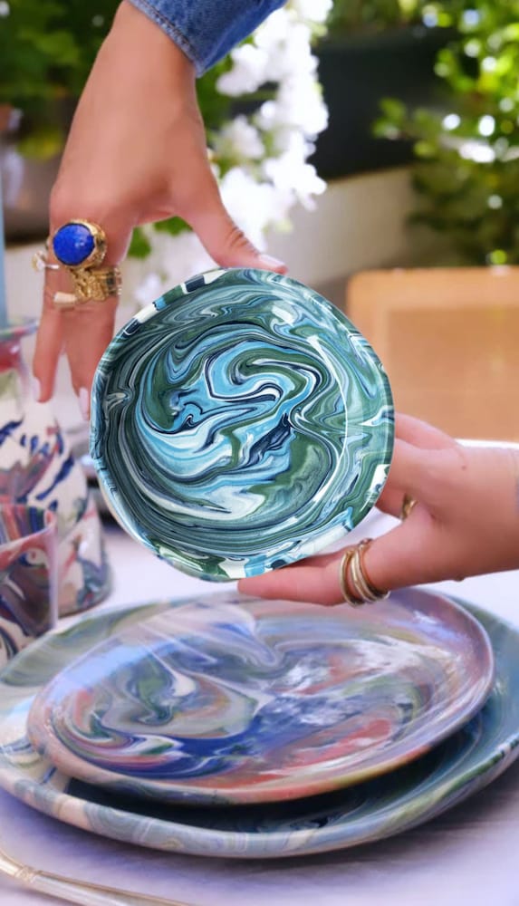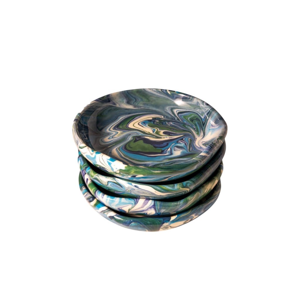 The Abstracto mini plates are handmade & designed in France. The natural pigments used include turquoise and green pigments. Its beauty is its round shape with imperfect edges. Perfect for serving an aperitif, a dessert, to use as a decorative object or to place your jewelry.