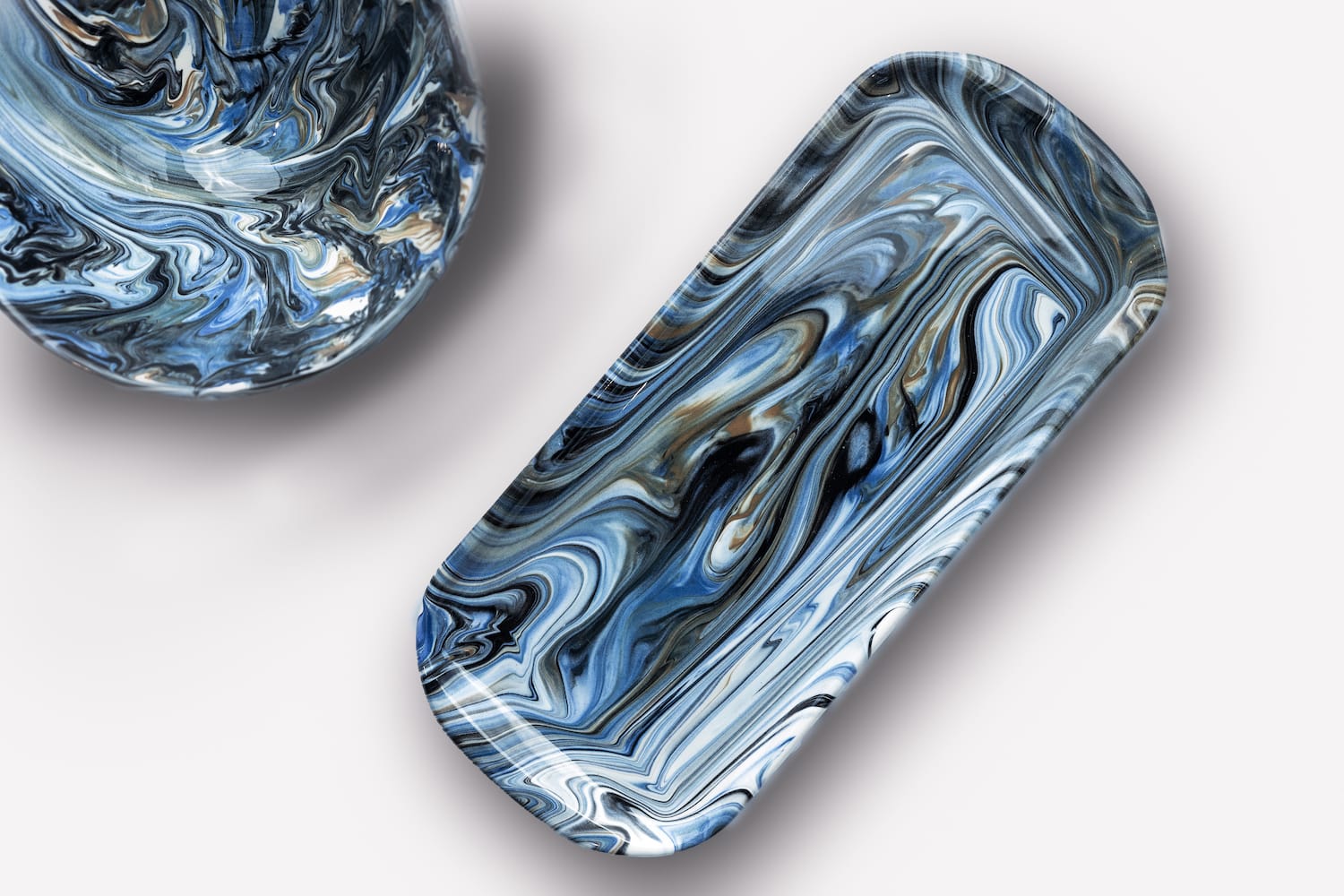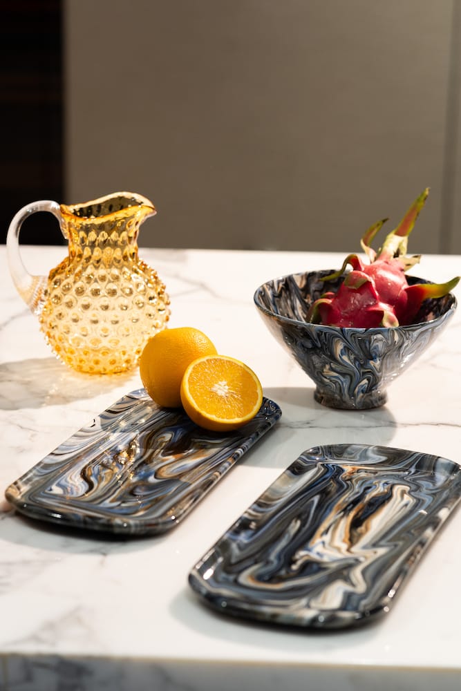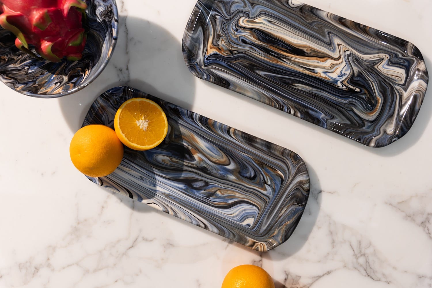 The Abstracto platters are handmade & designed in France, in an intuitive and random movement with a blend of natural pigments in wintery navy and black tones. It is a unique piece that can be used as a platter to beautify your table setting and elevate your hosting game.
