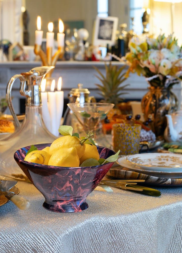 The Abstracto salad bowl is handmade & designed in France. They are decorated in an intuitive and random movement with black, red and blue pigments, like an erupting valcano’s molten magma. It is a unique piece that can be used as a decoration by itself or as a fruit bowl as a table centrepiece.
