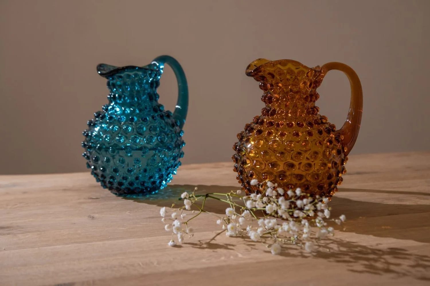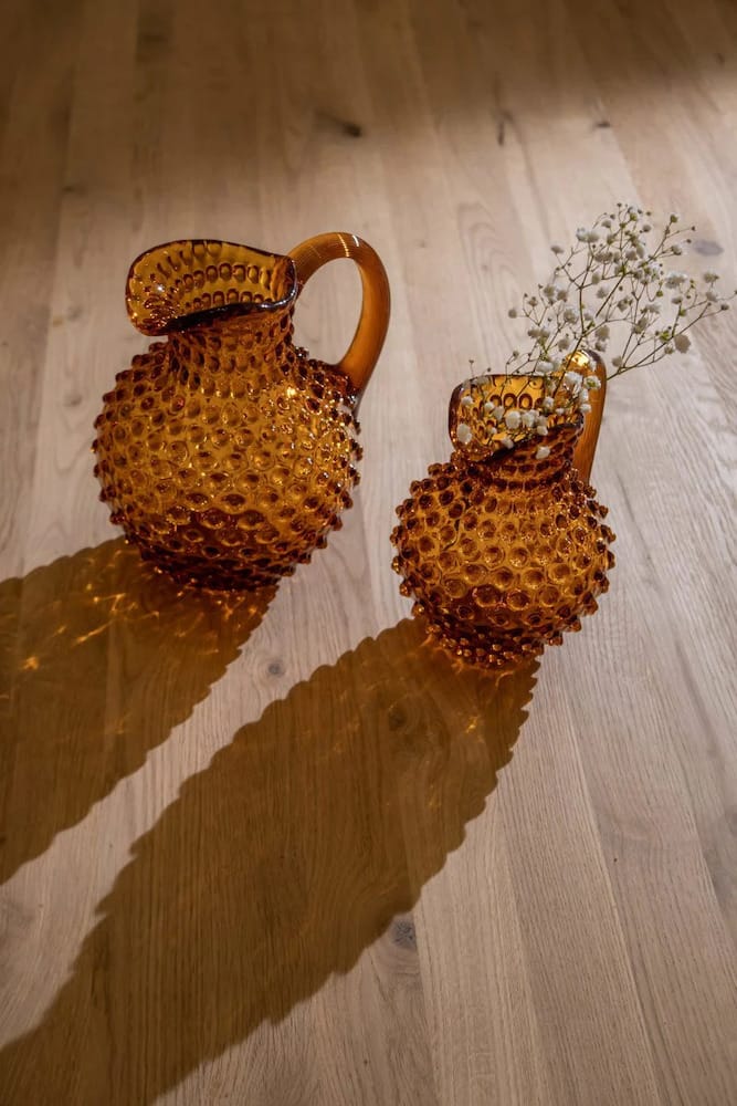 Whether it’s wine or lemonade, prepare to liven up any casual indoor or outdoor gathering with our all-purpose hobnail amber glass jug. A modern approach towards the Bohemian glass tradition combined with the elegance of the crystal glass, your amber hobnail jug will make your interior shine.The jug can hold up to 1 litre of the beverage. Premium features such as a tapered handle give you a comfortable hold on the jug while the ice lip restrains wayward ice cubes.