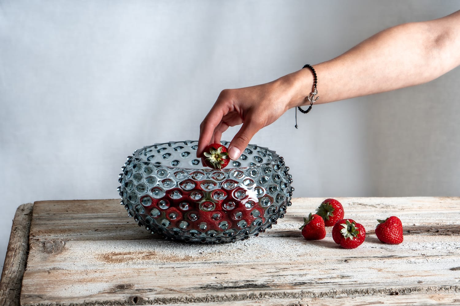 Bring blue class to the table with this unique take on the modern salad bowl. With its high curving sides, the handcrafted hobnail design allows light to reflect through it beautifully, making it the perfect gift idea for that special birthday or anniversary.