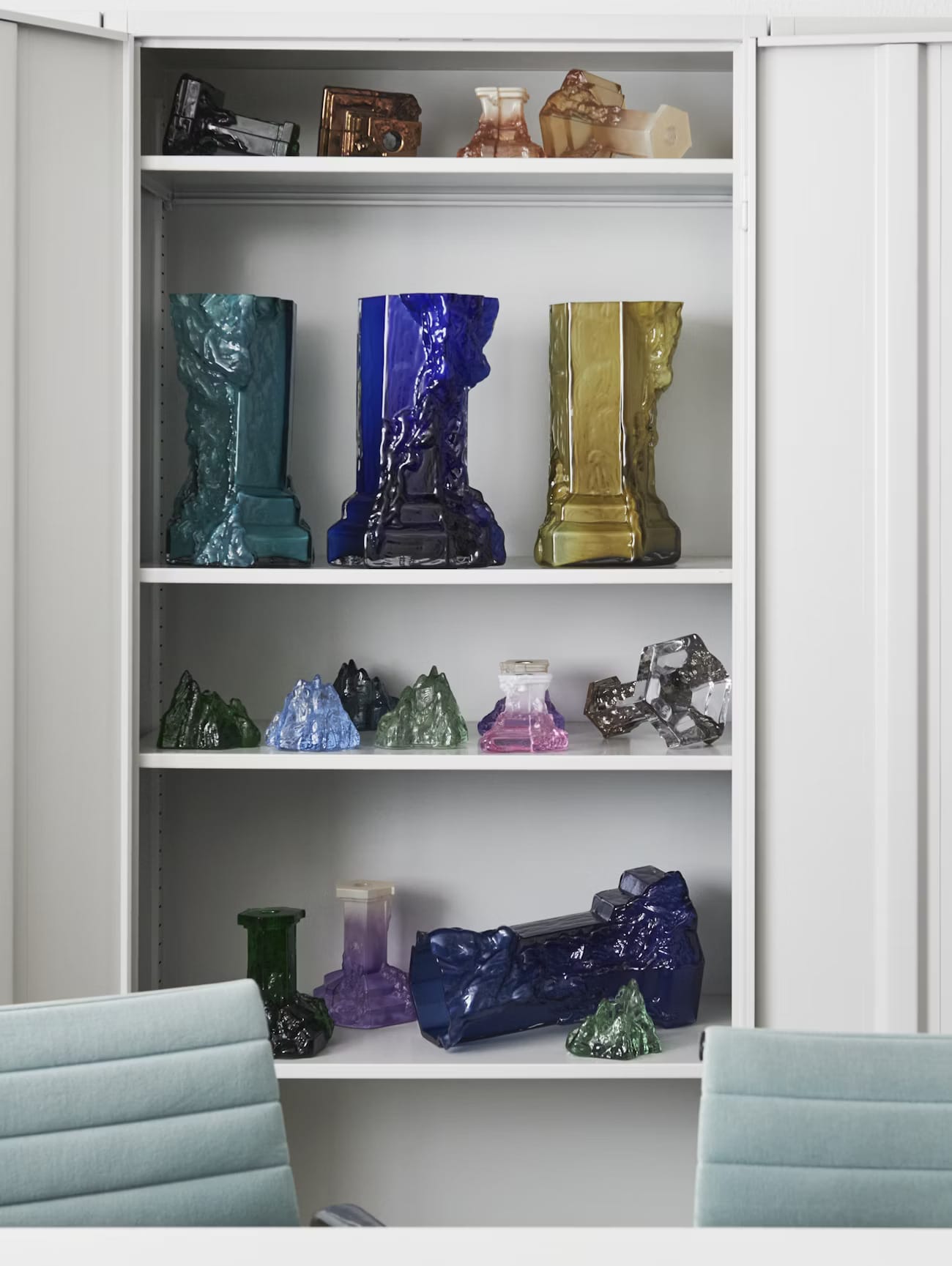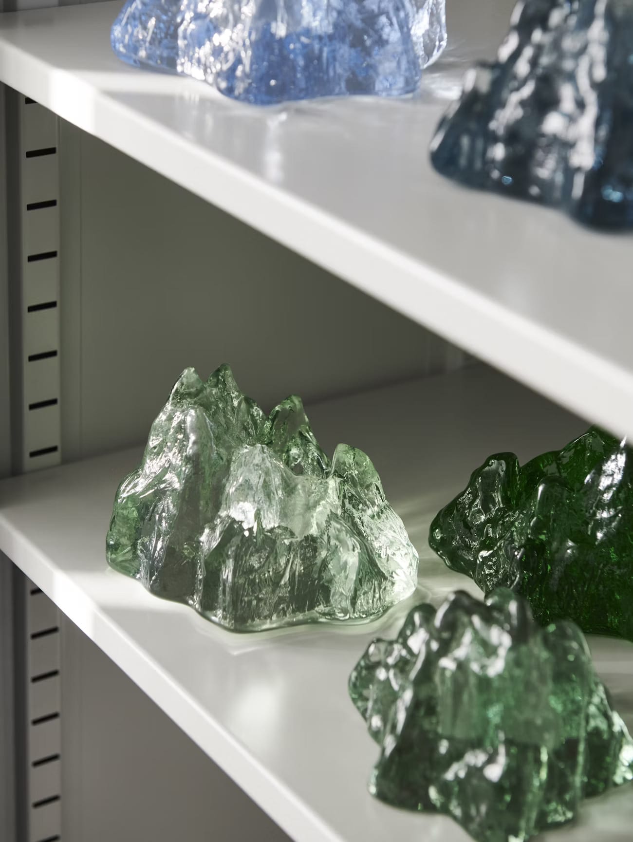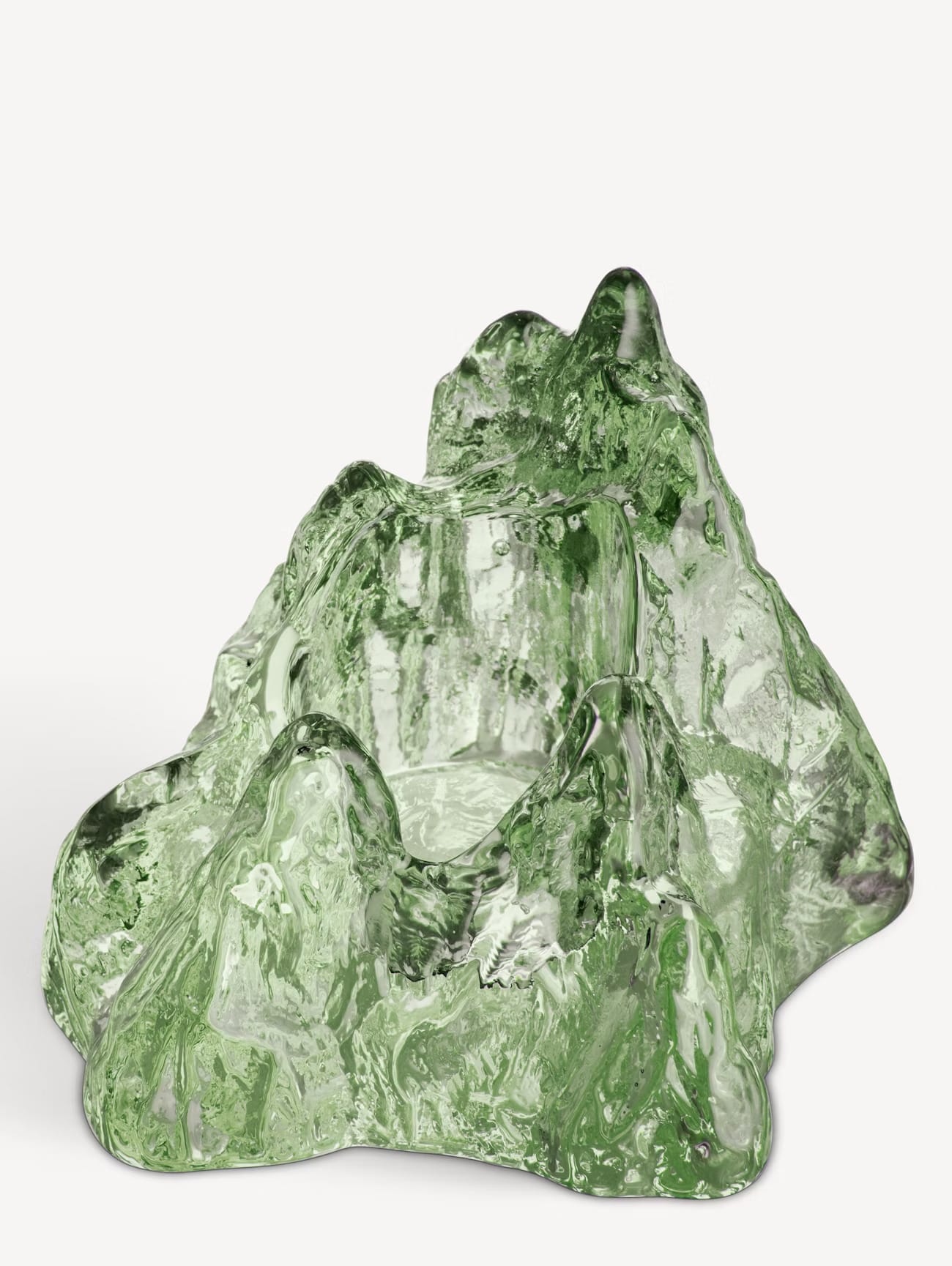 The Rock series was created as a tribute and paraphrase to the 50th anniversary of Snowball, Ann Wolff’s iconic classic. The familiar, irregular surface is reused, but The Rock is a work of art in its own right. This votive is in green colored glass, with a dramatic silhouette and a contemporary color palette.