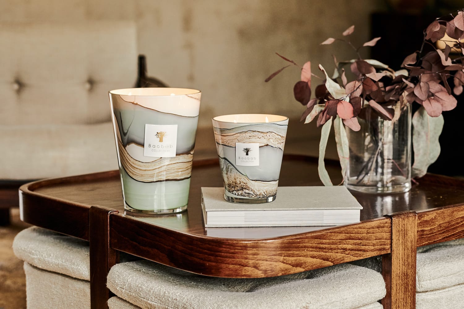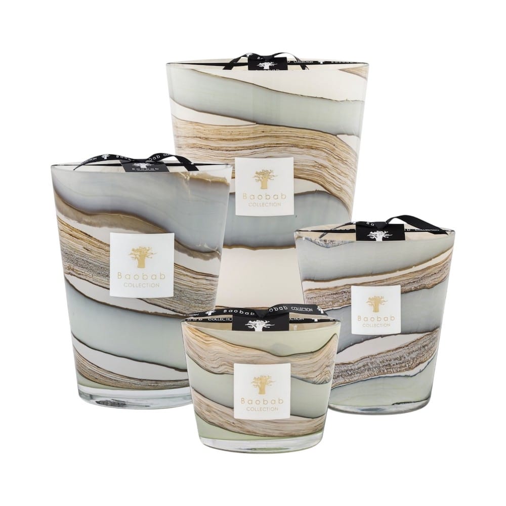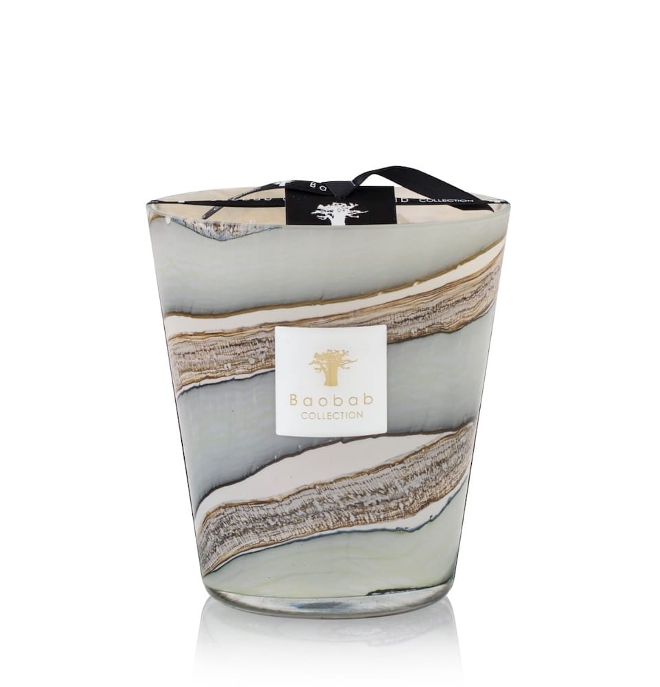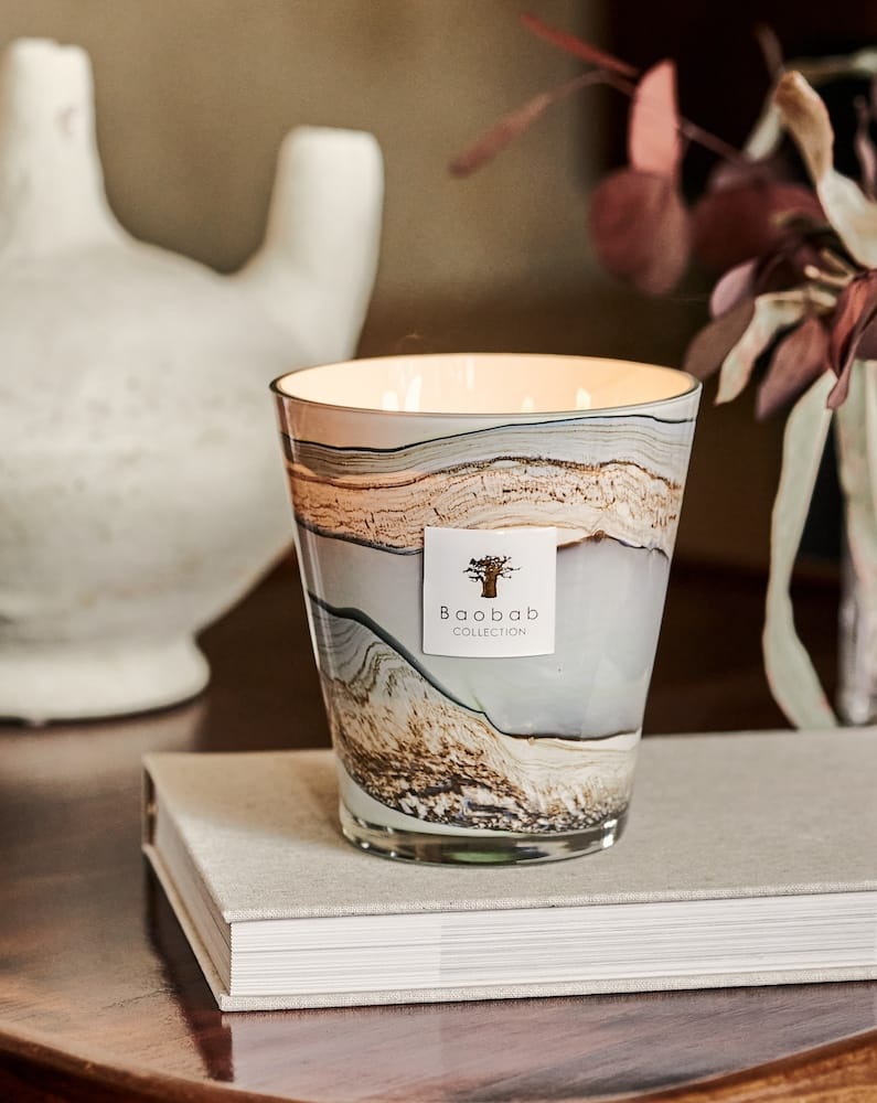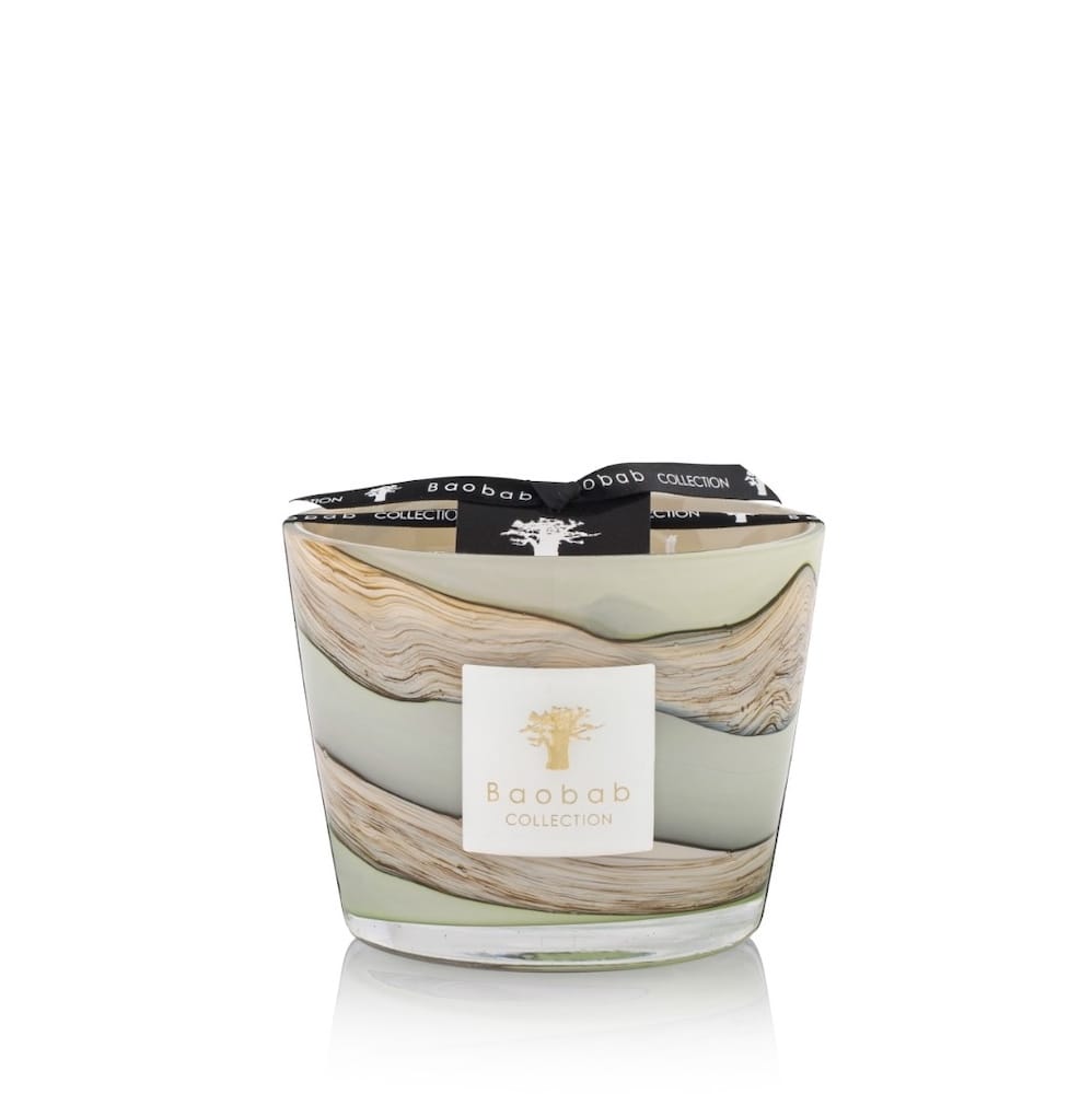 The Sonora scented candle is embodied in a highly sophisticated hand-blown glass. The colors that form random lines on the glass are an explosion of refined tones ranging from celadon green to blue-grey shades.
